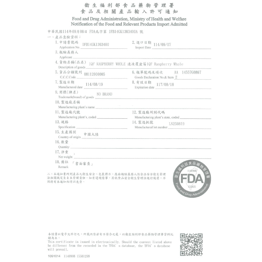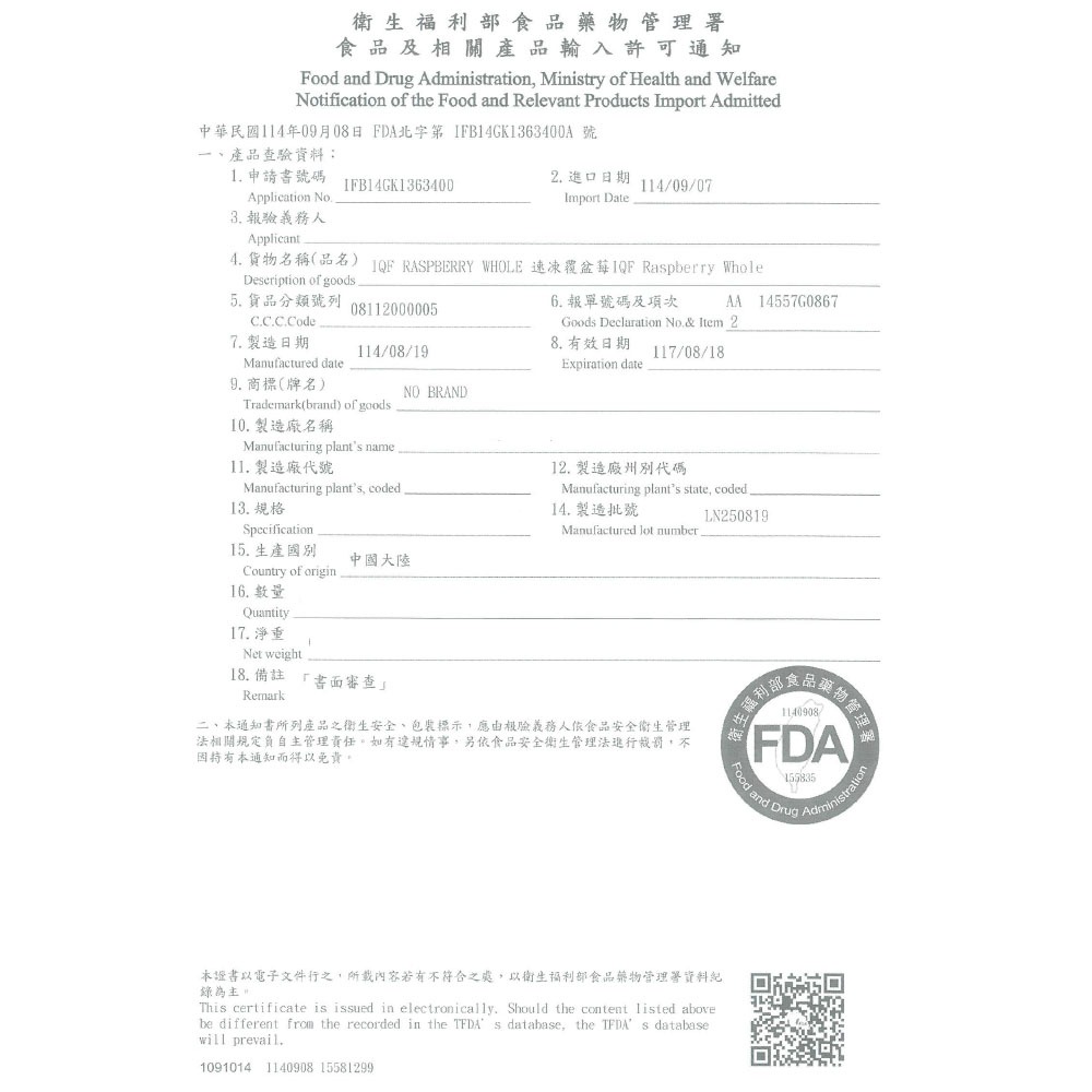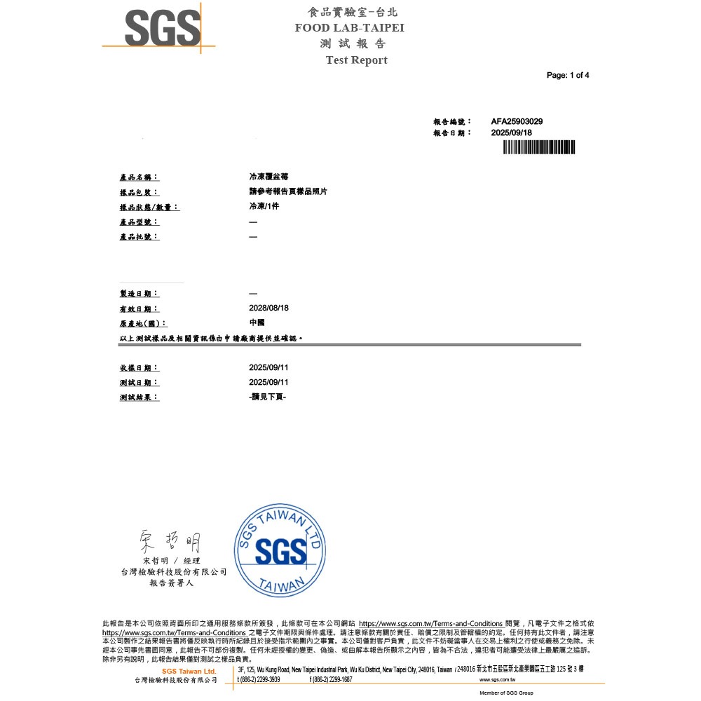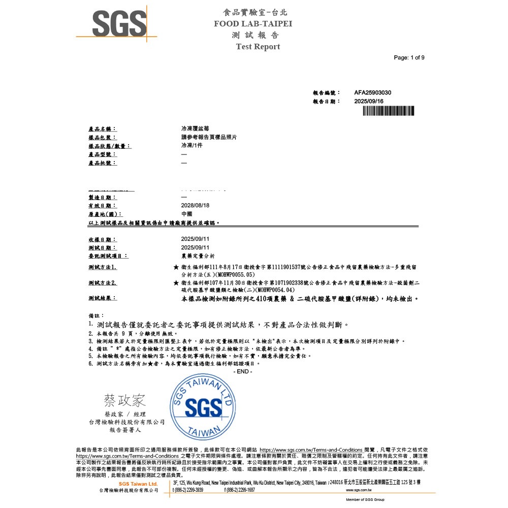 【檢驗報告】中國進口覆盆莓 (檢驗項目:農殘/重金)有效日期: 2028/08/18