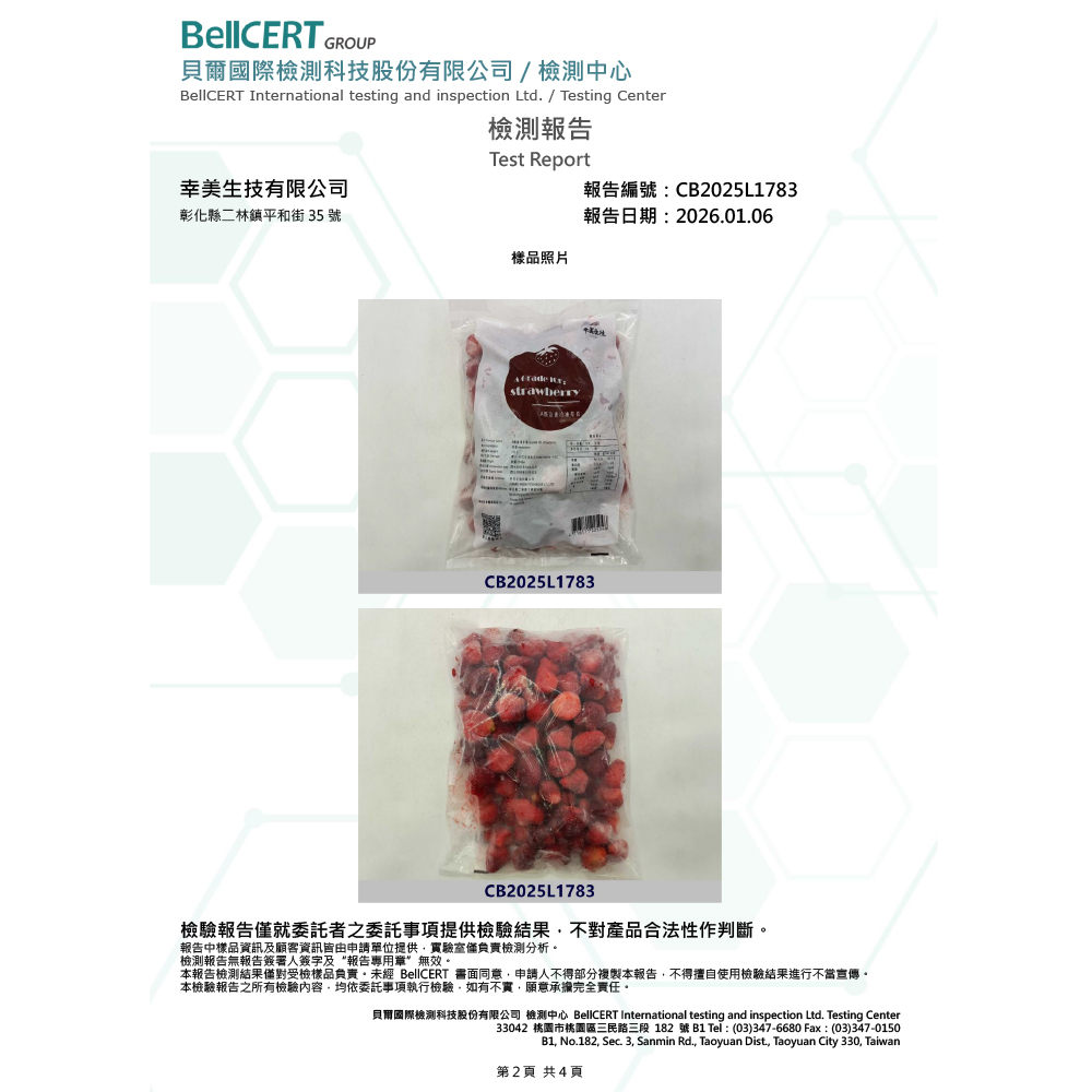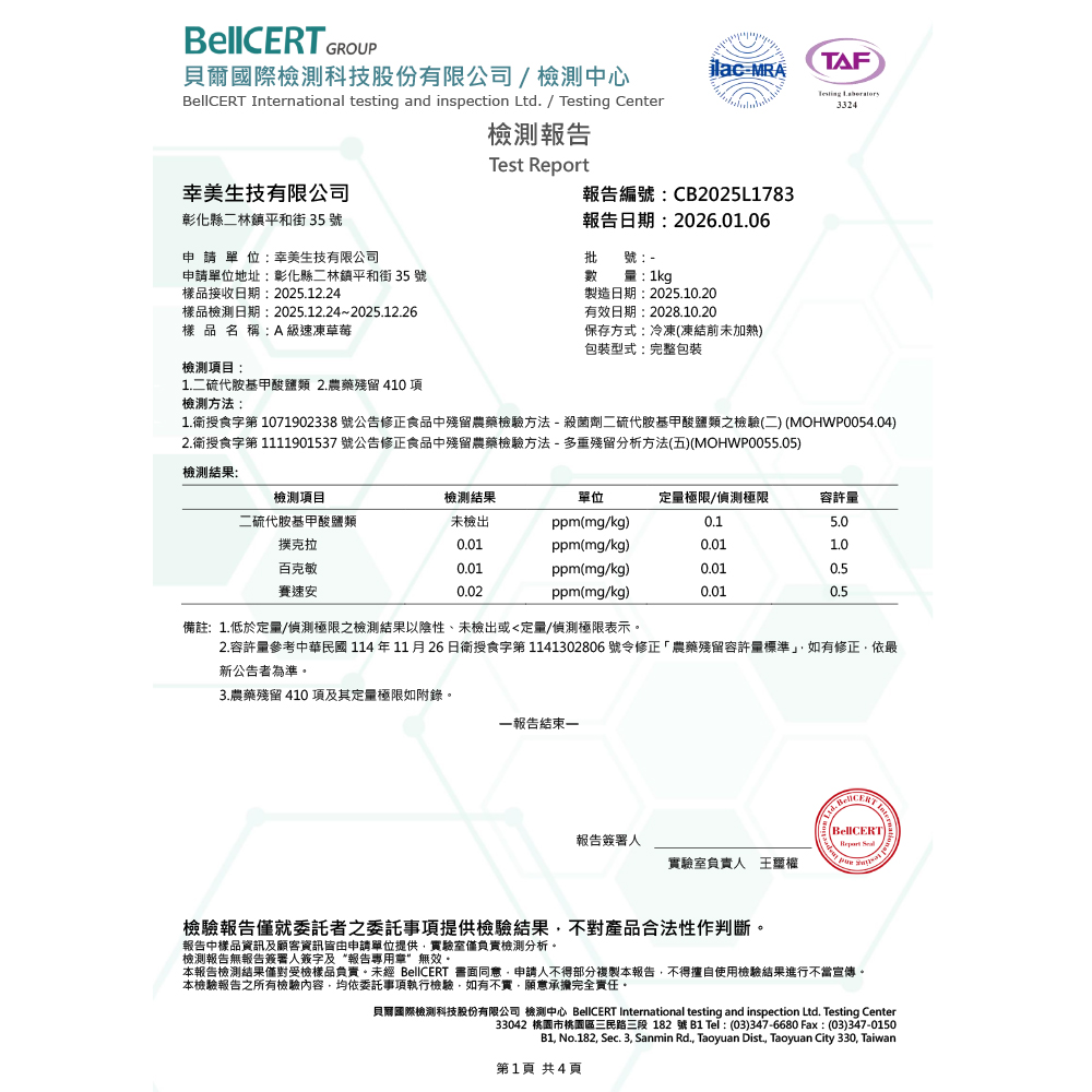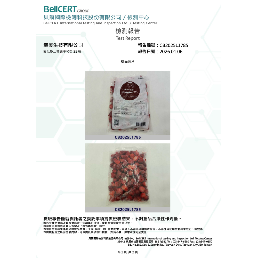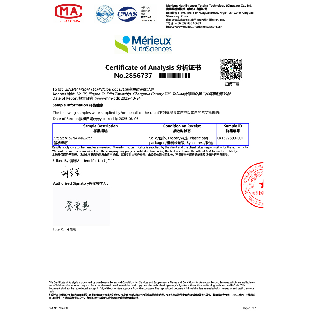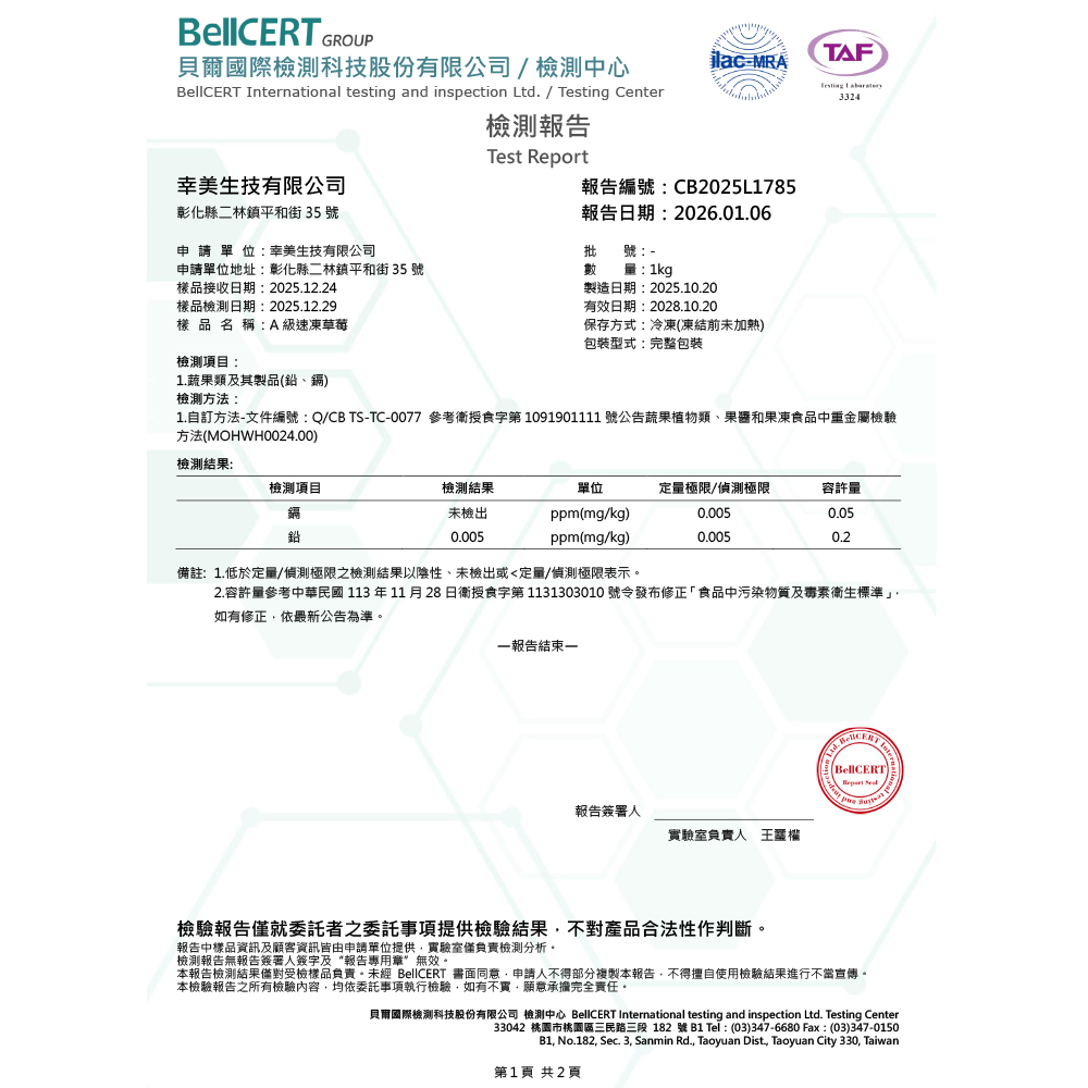 【檢驗報告】中國進口草莓 (檢驗項目:農殘/重金/A肝/諾羅)有效日期:2028/10/20