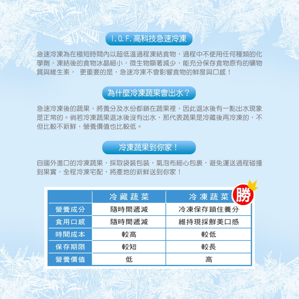由當地農民現採現切後立即冷凍,採用個別冷凍技術, 先凍結果肉再進行包裝。
