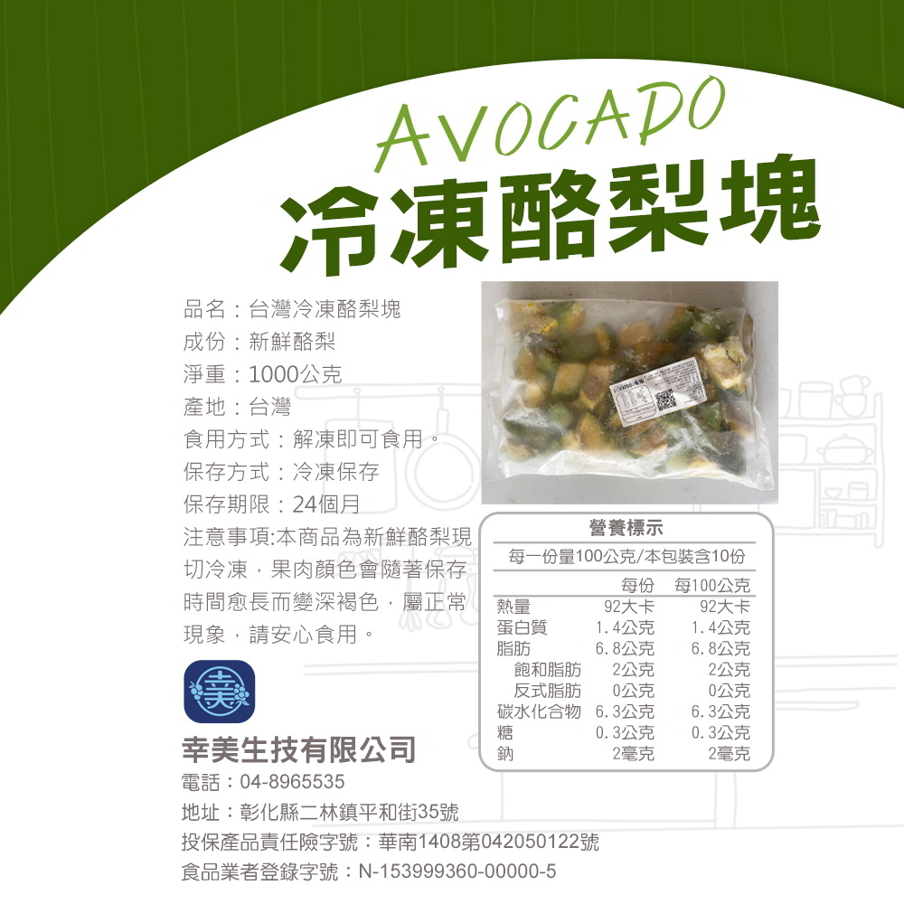 【缺貨中】台灣冷凍酪梨塊1公斤/包