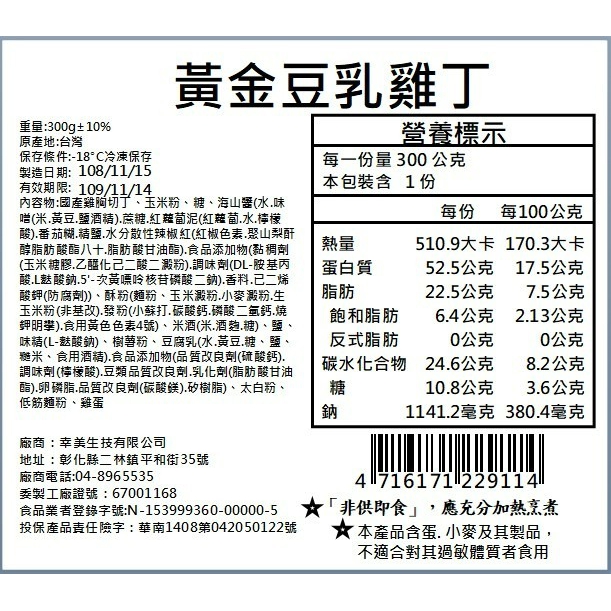 【幸美肉品】批發 烤雞系列-黃金豆乳雞丁300g/包(40包/箱)